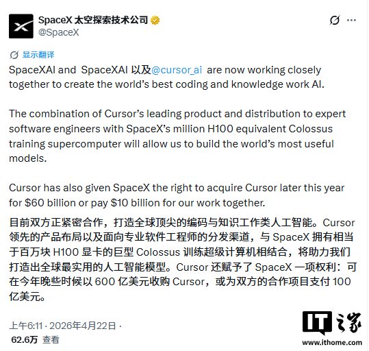 IT之家 4 月 22 日消息,埃隆 · 马斯克旗下太空探索技术公司 SpaceX、人工智能公司 xAI 和社交媒体平台 X 的业务组合即将进行首次公开募股(IPO),在此之际,SpaceX 宣布了一项颇为奇特的协议:要么以 600 亿美元(IT之家注:现汇率约合 4098.84 亿元人民币)收购自动化编程平台 Cursor,要么支付 100 亿美元(现汇率约合 683.14 亿元人民币)的费用。收购这家专注于人工智能编码的初创公司,或有助于 xAI 的工具与市场领头羊 Anthropic 以及其他竞争对手一较高下。